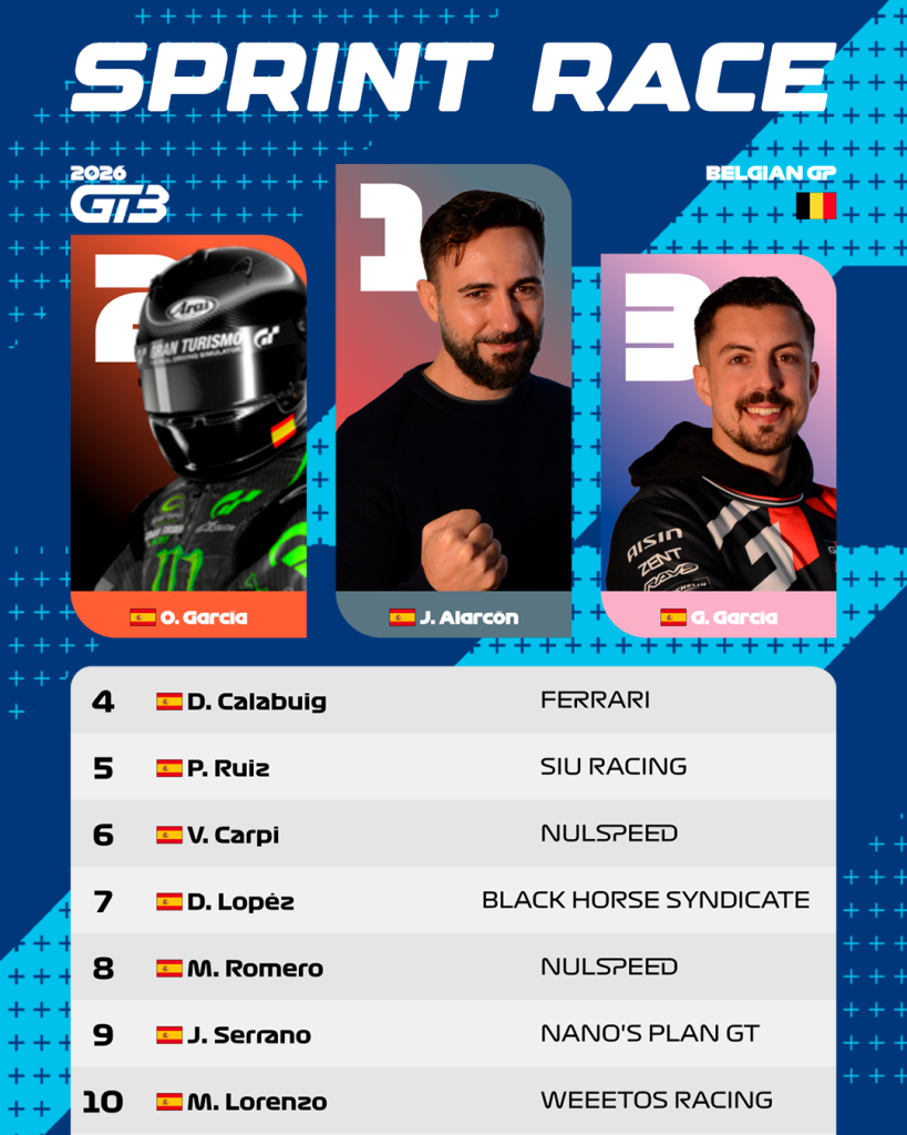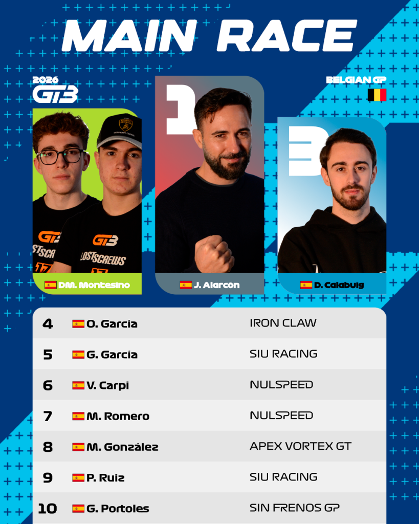 Race 1 | Spa-Francorchamps Grand Prix Detalles Fecha Hora Liga Temporada 18 de enero de 2026 20:45 Gran Turismo Brothers 2026 Vista previa Cuadro de puntuación # Piloto 44A. Parra1Alvaro Cortes35C. Hormigo Vídeo Vídeo